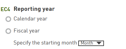 Participants are required to specify the starting month of their fiscal year. If participants select Fiscal year, starting months between February and June must correspond to calendar years 2025/2026. For example, an entity reporting from April to March will be considered covering the period of April 2025 - March 2026. On the other hand, starting months between July and December must correspond to calendar years 2024/2025. For example an entity reporting from October to September will be considered as covering the period of October 2024 - September 2025.