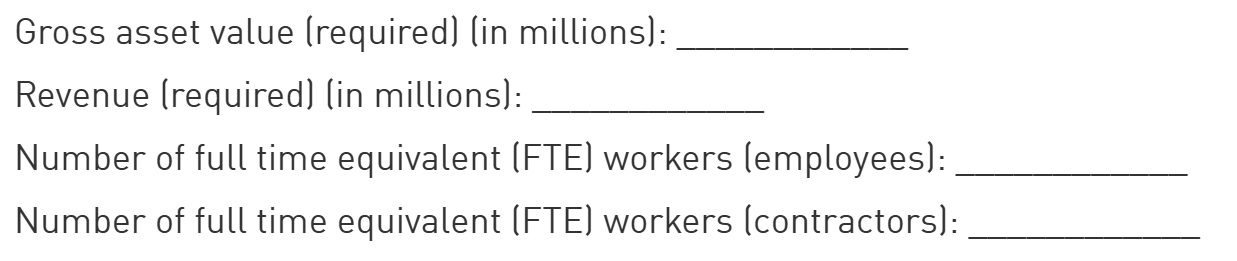 Establish the economic size and number of Full Time Equivalent (FTE) workers of the entity. GAV and revenue are information used (as denominators) to calculate intensity performance metrics in the Performance Component.