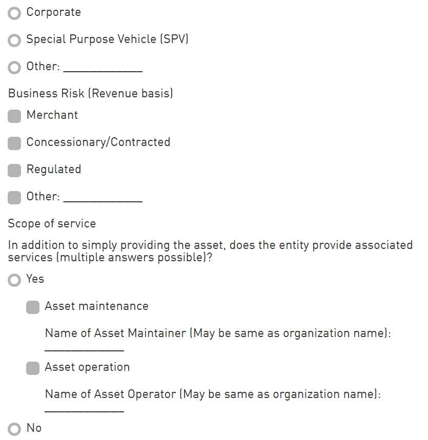 Scope of Service: Select whether the entity provides associated services in addition to providing the asset itself. The associated services may be Asset Maintenance and/or Asset Operation. This section then determines whether the Scope of Service provided by the entity is: