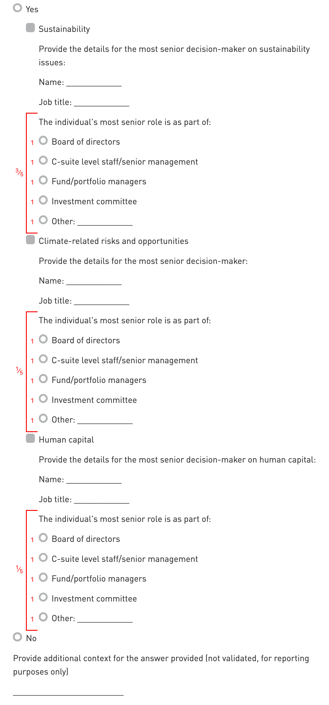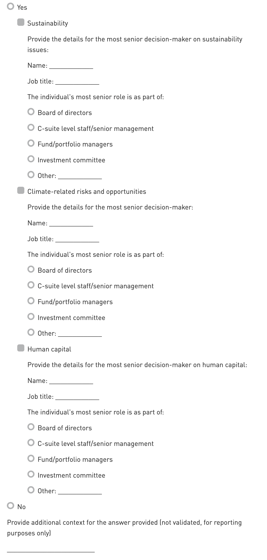 List a specific senior decision-maker’s position title who is accountable for sustainability, Human Capital, and/or climate-related issues. Vague answers will not be sufficient for validation. Ensure that the ‘Other’ answer provided is not a duplicate or subset of another option (e.g. “Executive Board” when “Board of Directors” is selected). It is possible to report multiple ‘Other’ answers. If multiple ‘Other’ answers are accepted, only one will be counted towards scoring. Answers referring to evidence and/or other indicators will not be accepted.