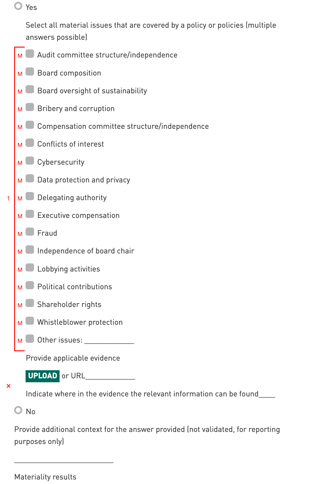 Material governance issues: Select all issues that are covered by the entity’s policy / policies. The policy or policies must exist and be valid during the reporting year provided in EC4. It is possible to report using the ‘Other’ answer option. Ensure that the ‘Other’ answer provided is not a duplicate or subset of another option. It is possible to report multiple ‘Other’ answers.