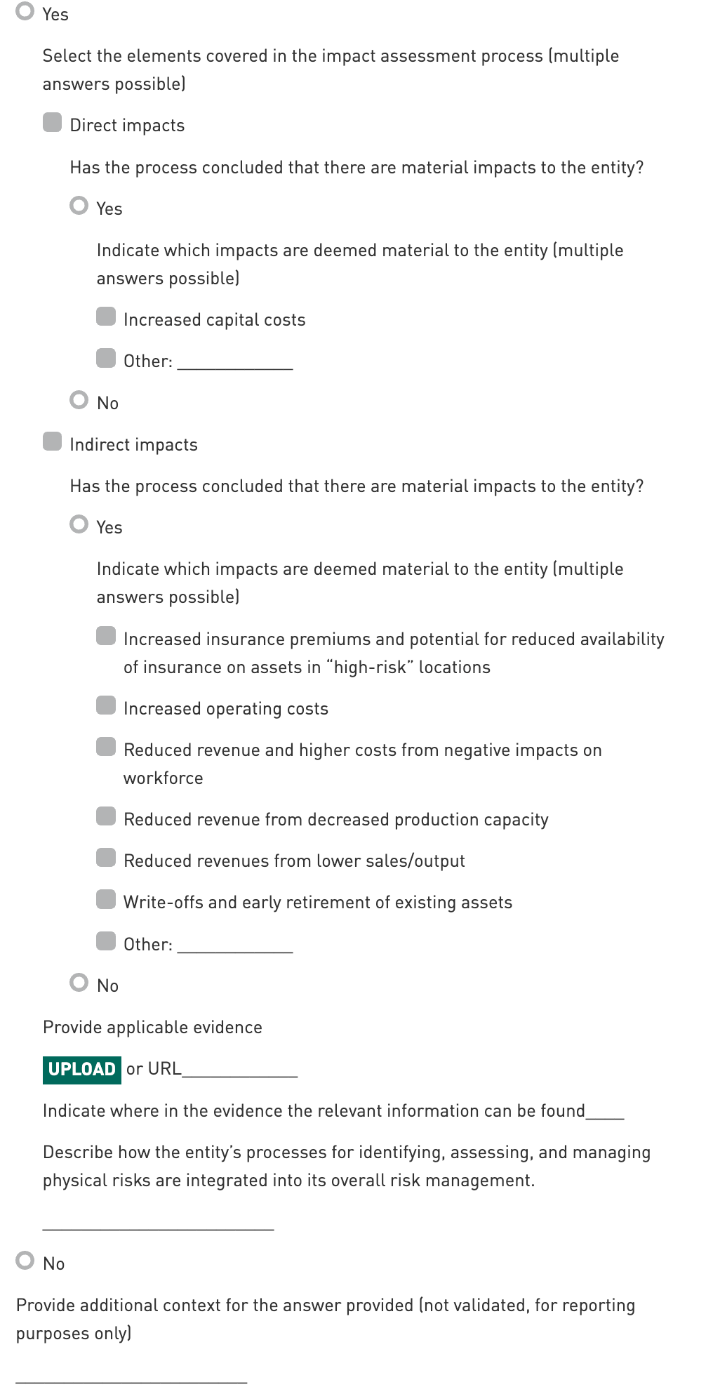 Select Yes or No: If selecting 'Yes', select all applicable sub-options. It is possible to report using the ‘Other’ answer option. Ensure that the ‘Other’ answer provided is not a duplicate or subset of another option.