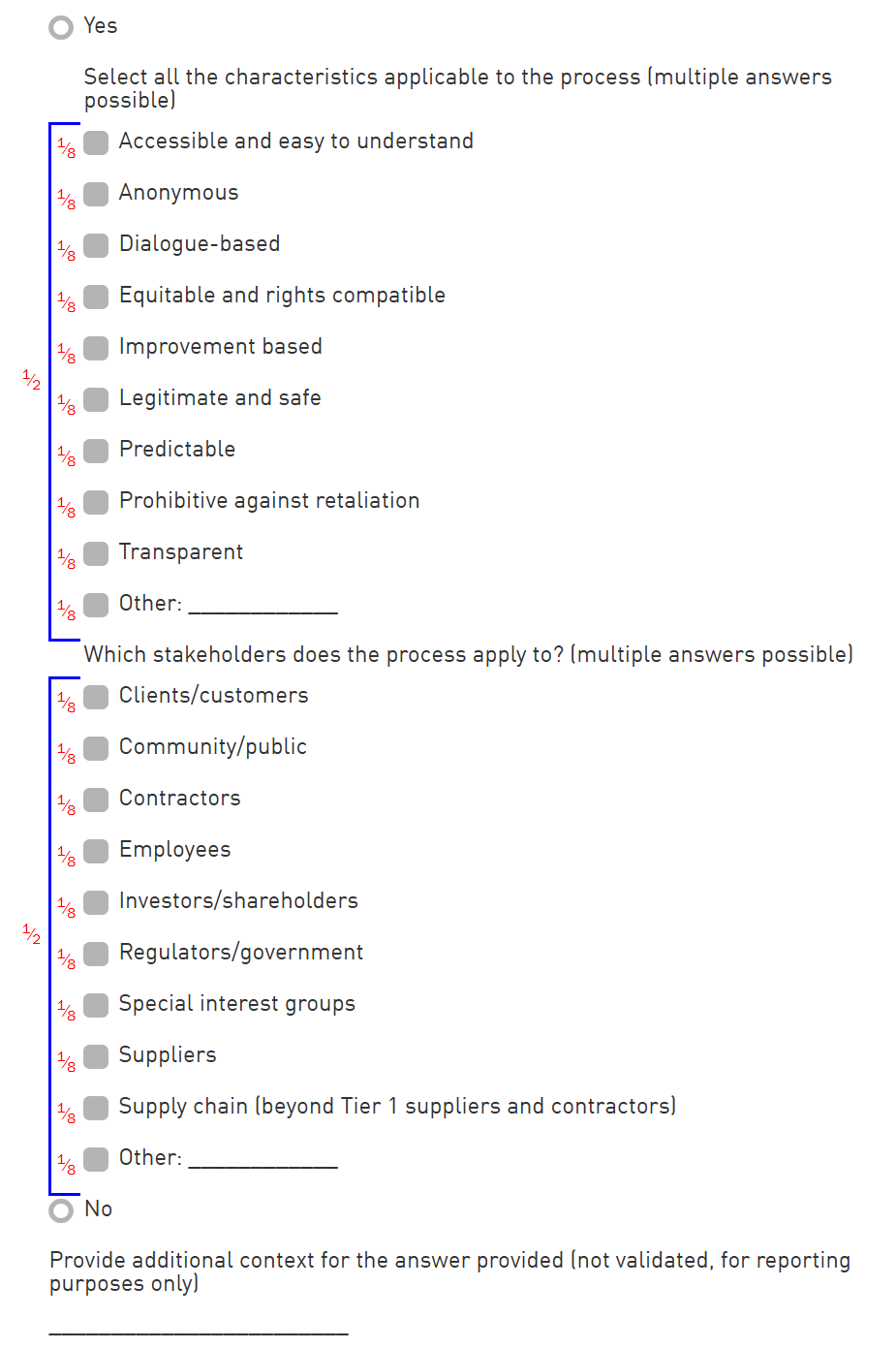 The scoring of this indicator is equal to the fraction assigned to the selected option, multiplied by the total score of the indicator.