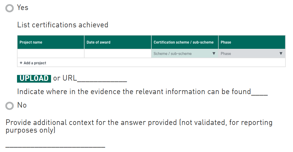 List certifications received: Describe all sustainability-related certifications achieved by the asset the entity wishes to report. For each of the certifications added to the table, it is mandatory to: