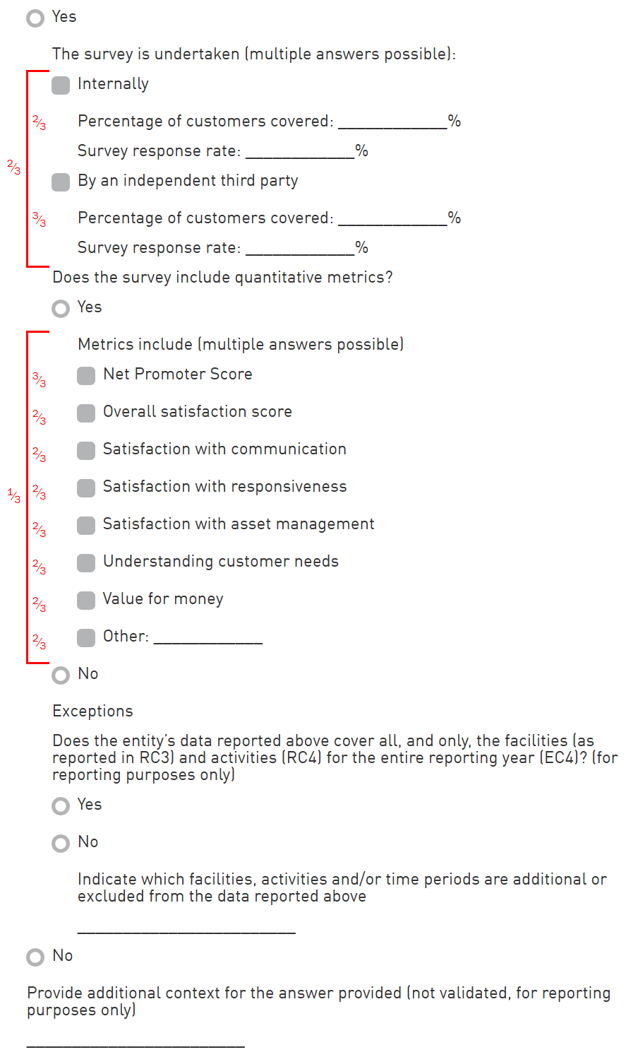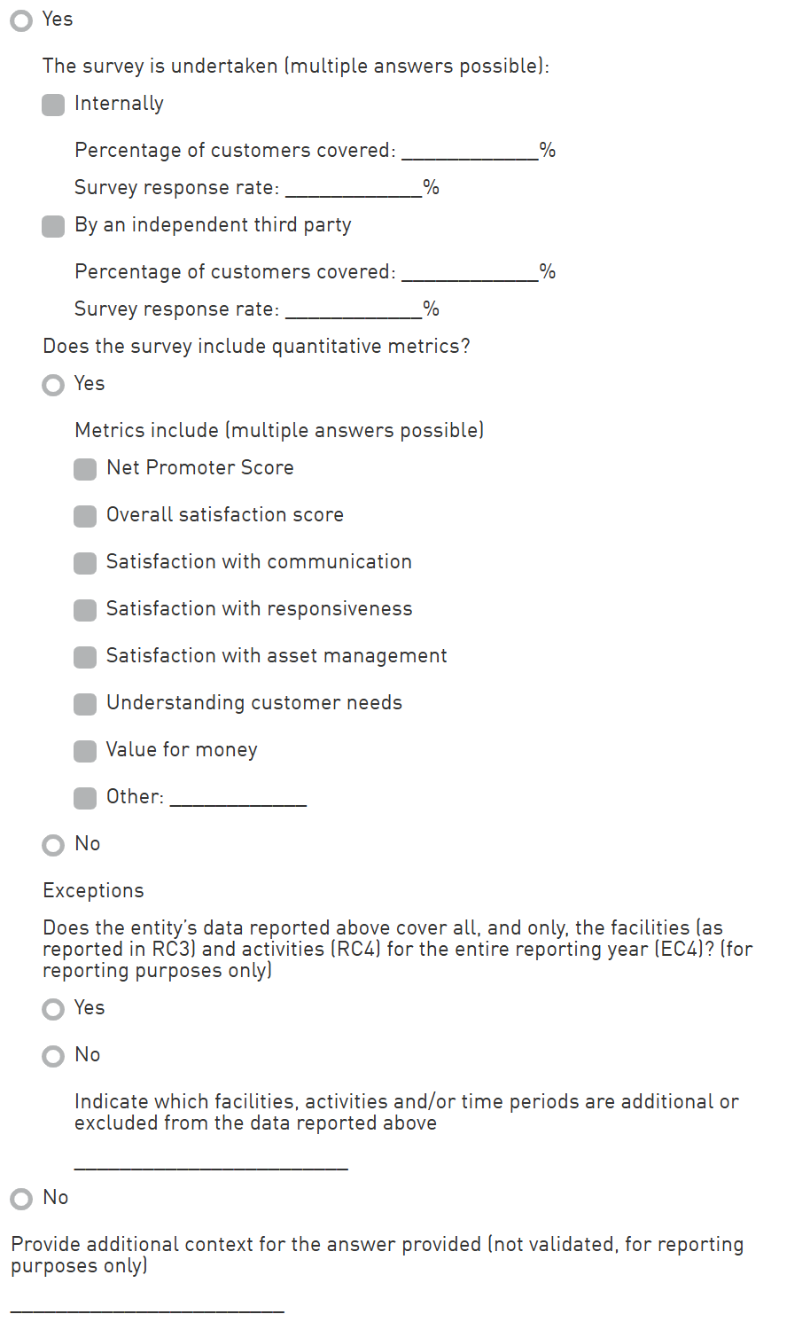 Survey metrics: The entity can indicate the quantitative metrics used for the survey. Reporting using the ‘other’ answer option is possible. Ensure that the ‘other’ answer provided is not a duplicate or subset of another option.