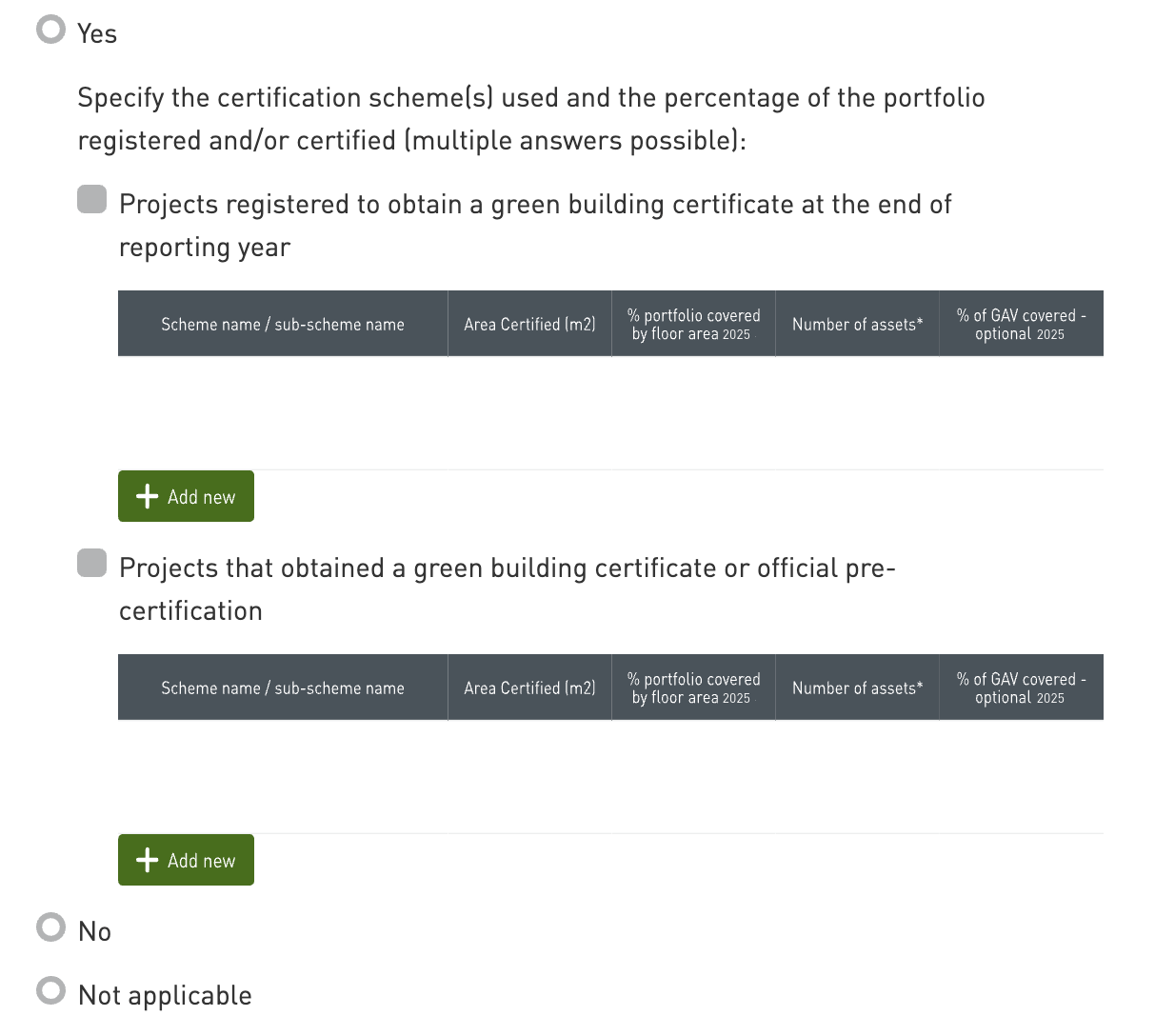 % of GAV (optional): % of GAV is calculated based on the GAV of assets registered or certified. To do so, this number should be calculated as the % of GAV of all assets certified to the respective scheme, adjusted by the % of floor area certified.