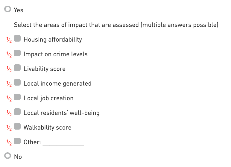 The scoring of this indicator is equal to the fraction assigned to the selected option, multiplied by the total score of the indicator.