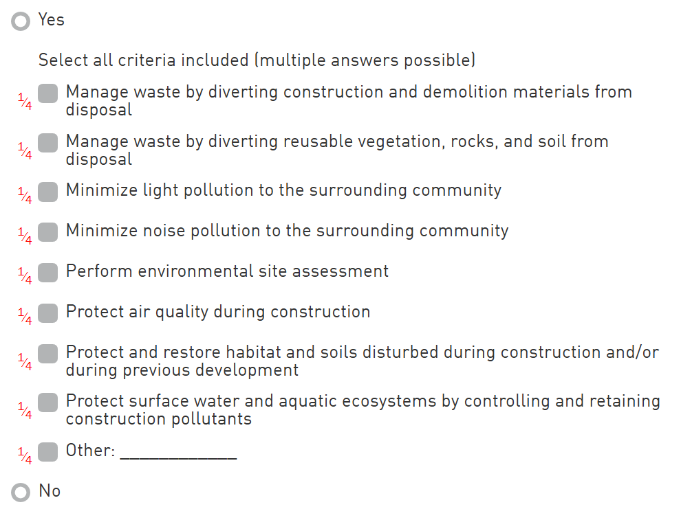 Other: State the sustainable site design/construction criteria. It is possible to add multiple other answers. If multiple other answers are acceptable, only one will be counted towards scoring.