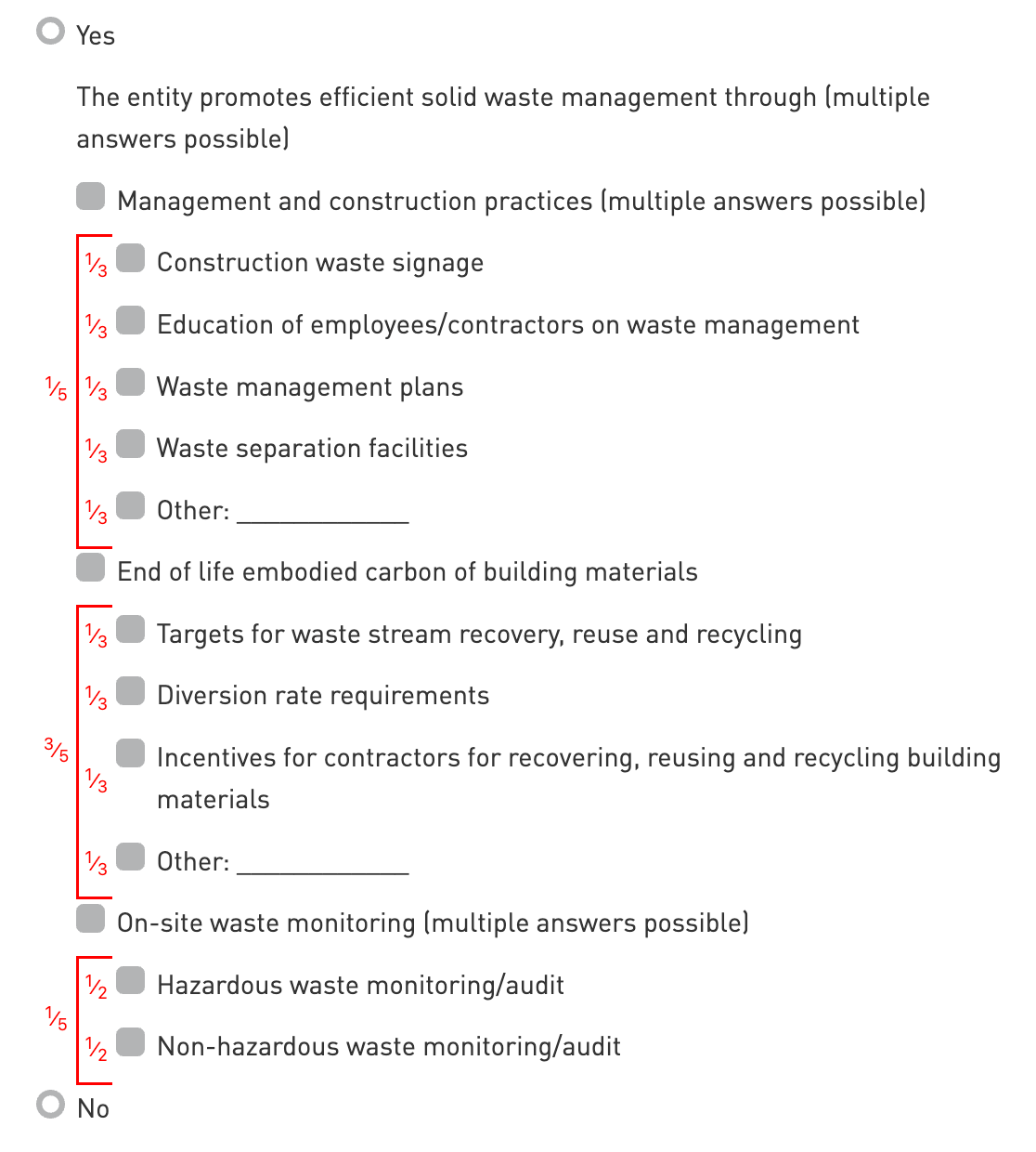 Select yes or no. If yes, select all applicable sub-options for (1) management and construction practices (2) end of life embodied carbon of building materials and (3) on-site waste monitoring.