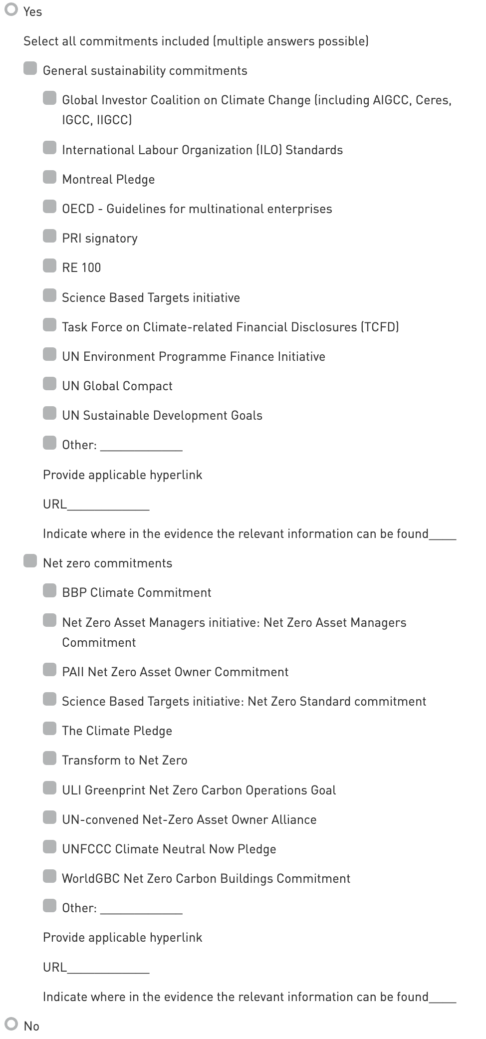 URL: Including a hyperlink is mandatory for this indicator, but it is used for reporting purposes only. Ensure that the hyperlink is not outdated and that the relevant page can be accessed within two steps. The URL should demonstrate the existence of publicly available commitments to Sustainability/Net Zero leadership relating to each of the standards and/or principles selected.