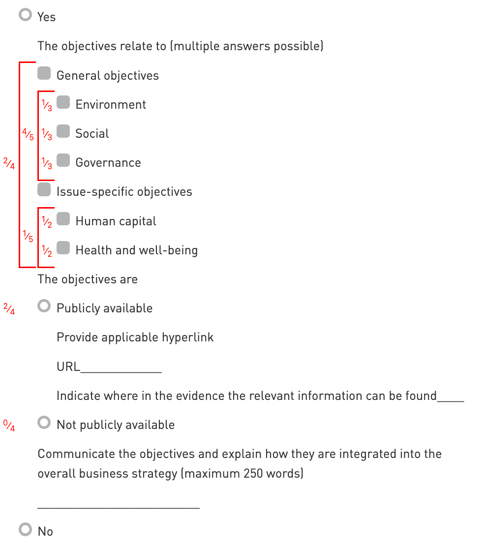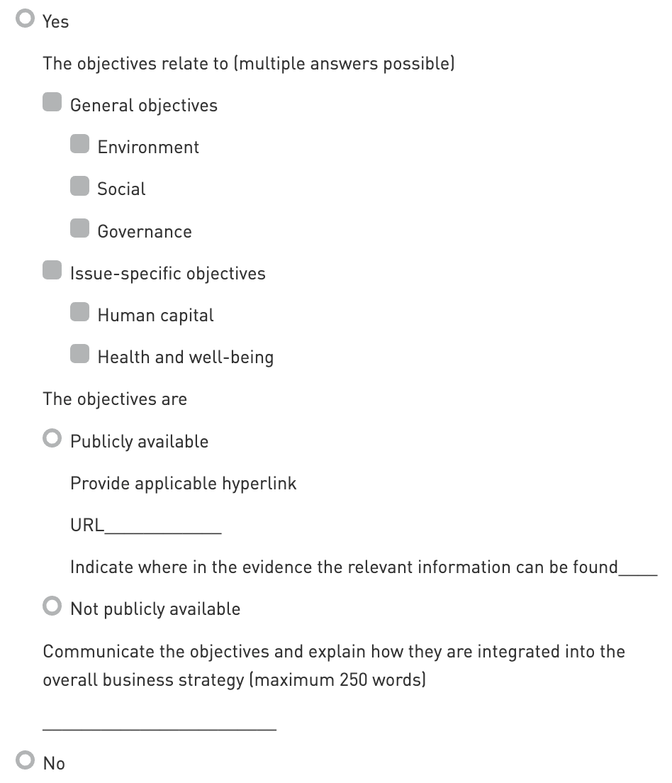 URL: When selecting "Publicly available," it is mandatory to include a hyperlink. The link will only be used for reporting purposes. Ensure that the hyperlink is not outdated and that the relevant page can be accessed within two steps. The URL should demonstrate the existence of publicly available sustainability objectives for each of the objectives selected.