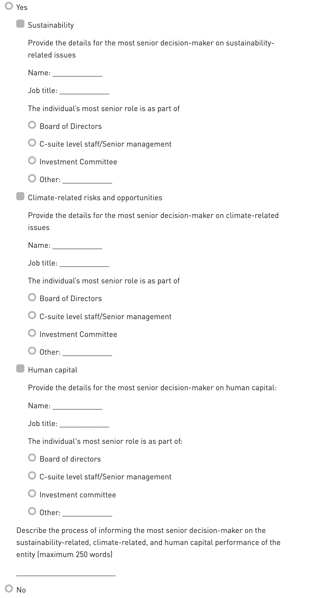 Does the entity have a senior decision-maker accountable for sustainability, climate-related, and/or human capital issues?