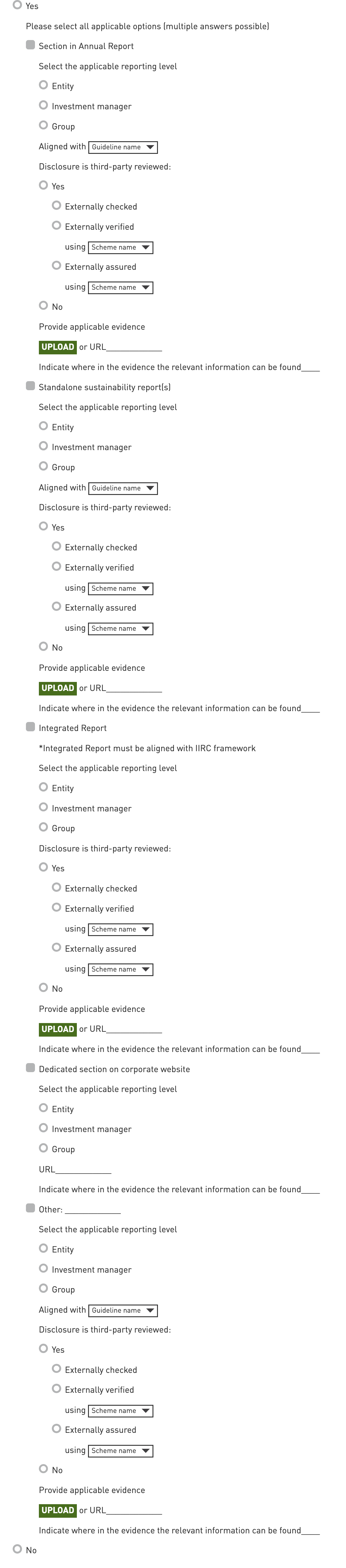 The evidence should sufficiently support all the items selected for this question. If a hyperlink is provided, ensure that it is active and that the relevant page can be accessed within two steps. It is possible to upload multiple documents, as long as it’s clear where information can be found. A piece of supporting evidence cannot be uploaded for more than one disclosure method selected, i.e., identical documents will not be accepted for more than one disclosure type.
