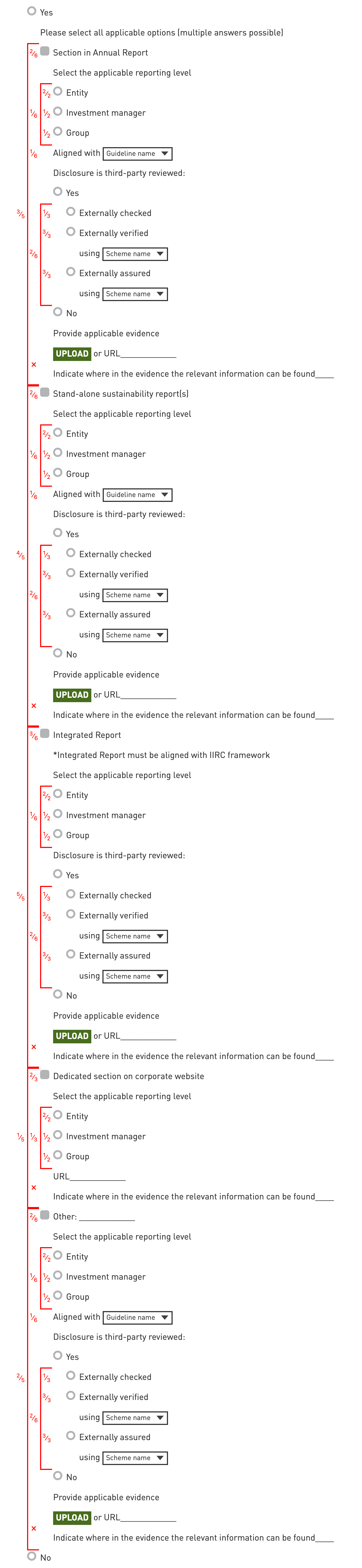 Reporting level requirements: Answers must clearly reference the applicable reporting level. If entity-level is chosen, then the sustainability actions and/or performance must be directly associated with the entity by name. For example, a fund manager or corporate group can only select entity-level reporting if there is a specific section of the disclosure dedicated to the entity that fully meets validation requirements. Group-level disclosures that do not have sustainability actions and/or performance specific to the reporting entity are not entity-level reports.