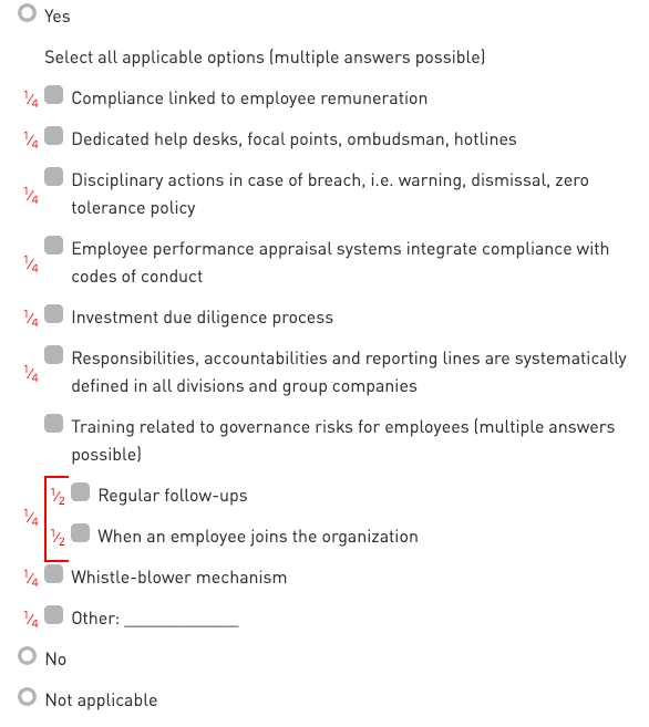 The scoring of this indicator is equal to the fraction assigned to the selected option, multiplied by the total score of the indicator.