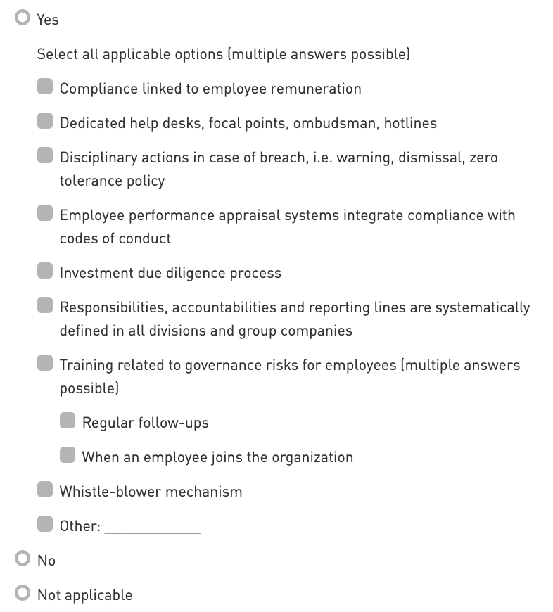 State the other system or procedure in place. Ensure that the other answer provided is not a duplicate of a selected option above (e.g., Anti-bribery training when 'Training related to governance risks for employees' is selected). It is possible to report multiple other answers. If multiple other answers are acceptable, only one will be counted towards scoring