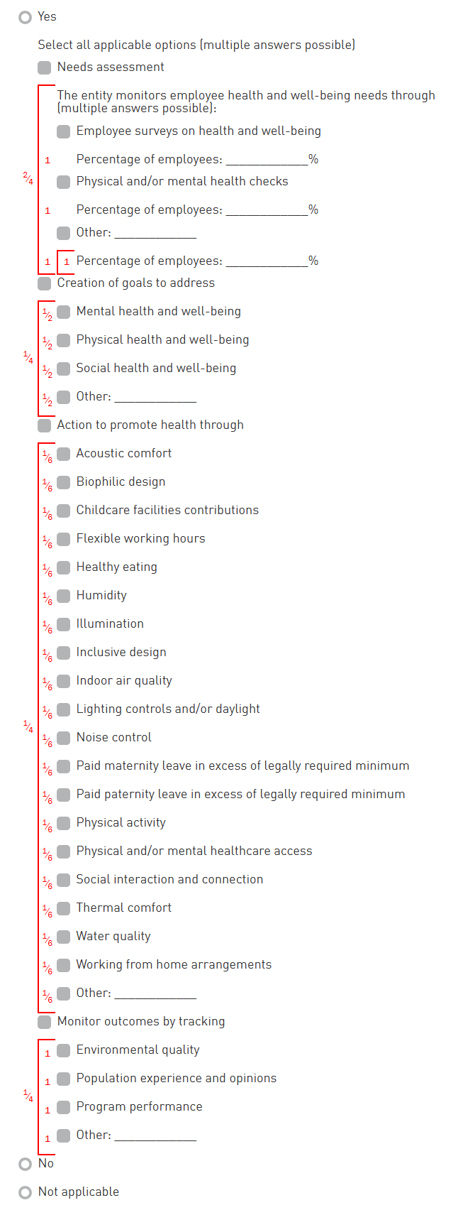 The scoring of this indicator is equal to the sum of the fractions assigned to the selected options and respective sub-options, multiplied by the total score of the indicator.