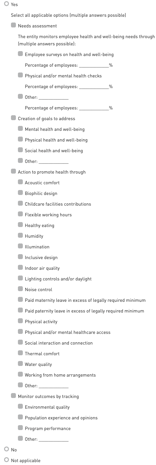 This indicator evaluates the scope and quality of the entity’s employee health and well-being program.