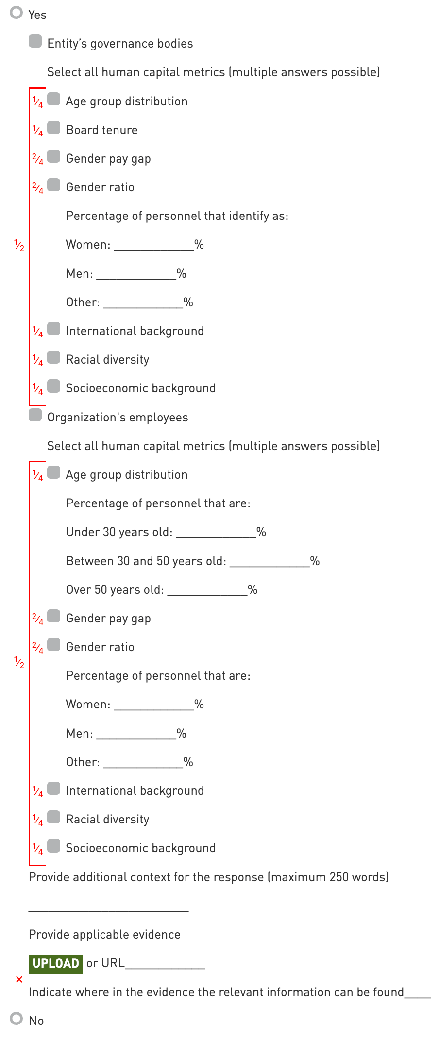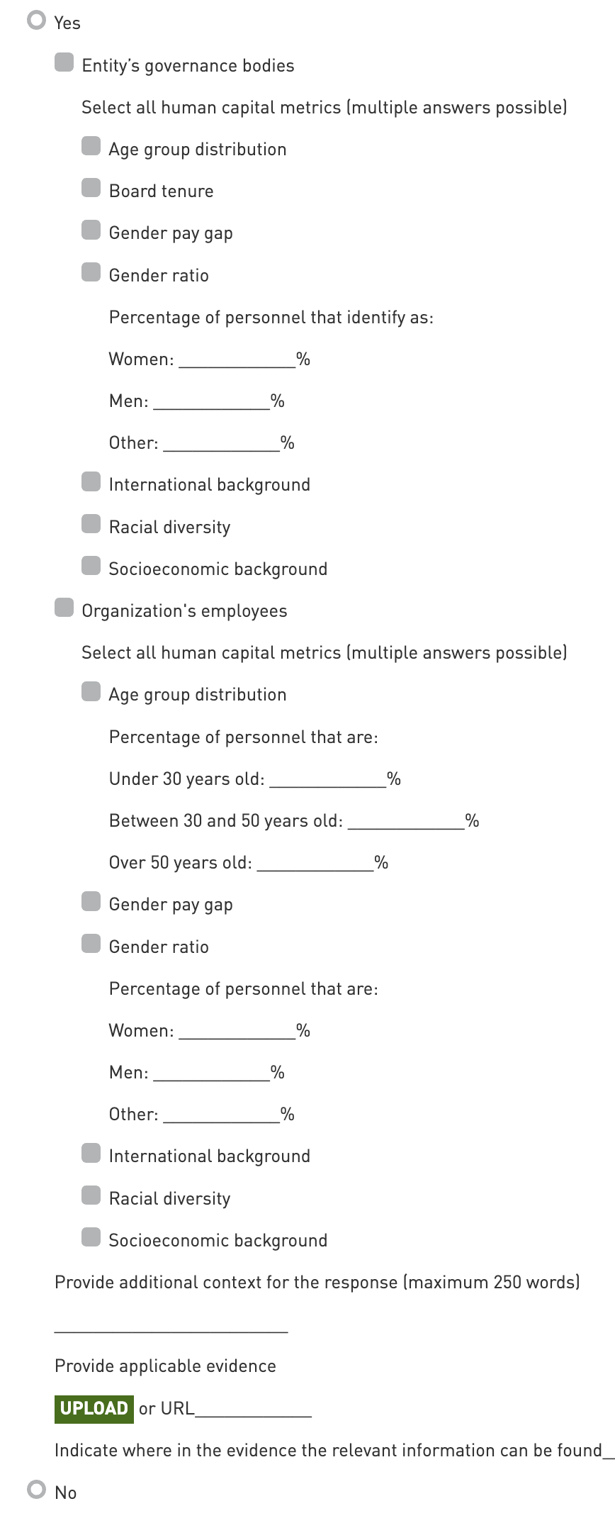 The provided evidence must indicate that the entity monitored human capital metrics for the selected parties. Acceptable evidence includes data visuals, excerpts from sustainability reports, internal tracking tools, or internal data summaries. Entities may also provide a formal narrative on corporate letterhead describing how the selected metrics are monitored. Sensitive information may be redacted, provided the submitted materials clearly demonstrate that the requirements have been met.