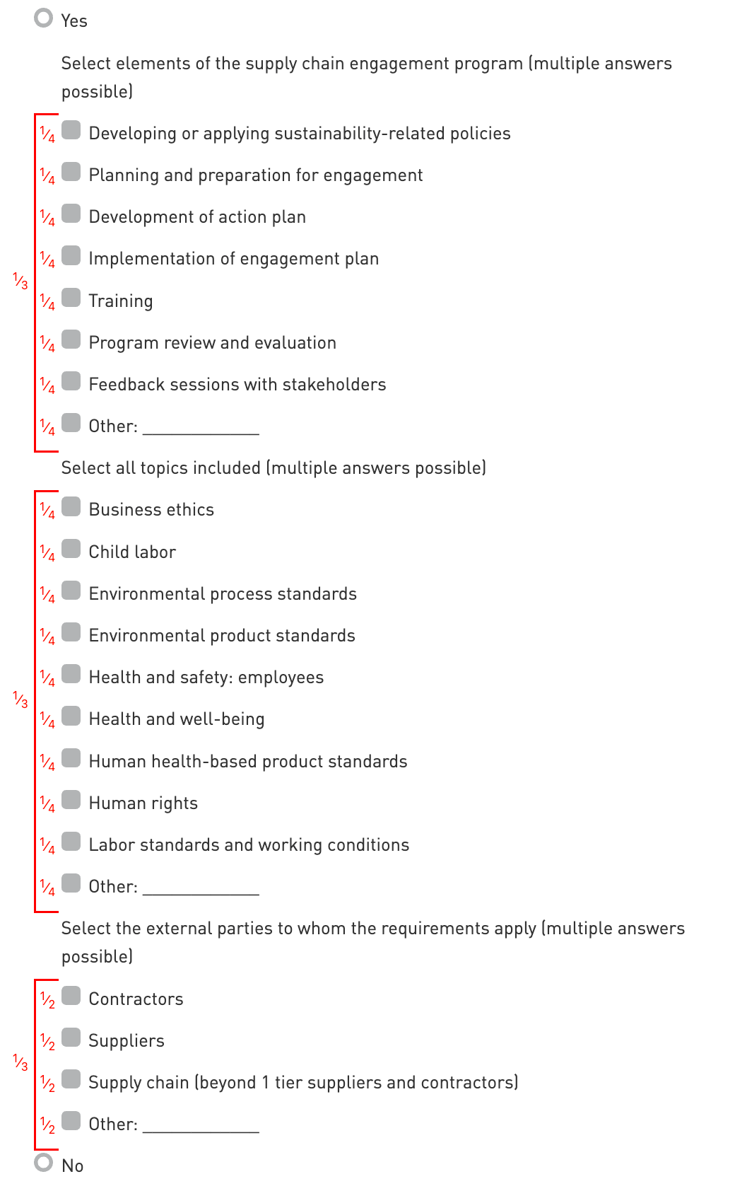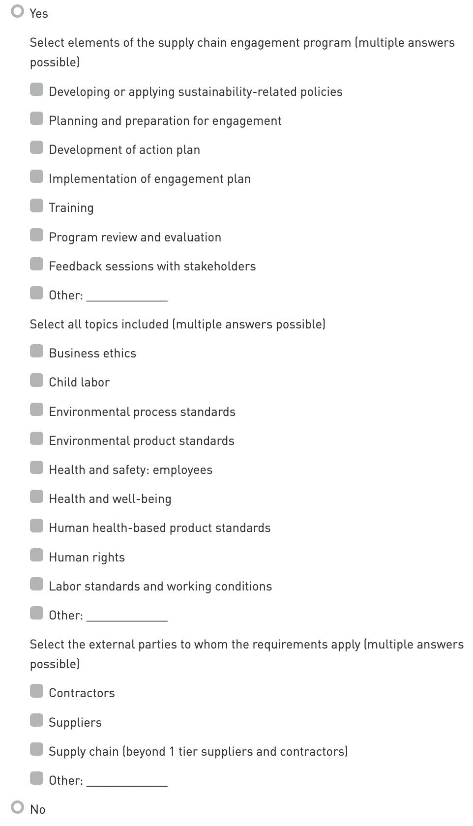 This indicator evaluates the management practices and requirements the entity uses to address supply chain risks. Procurement is a key lever for embedding sustainability expectations into the supply chain, and this indicator considers how those requirements are applied across both existing and new contracts.