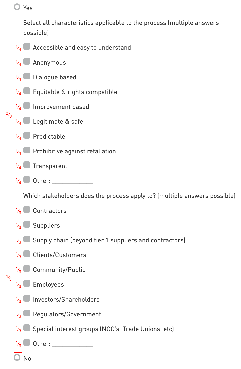 The scoring of this indicator is equal to the sum of the fractions assigned to the selected options and respective sub-options, multiplied by the total score of the indicator.