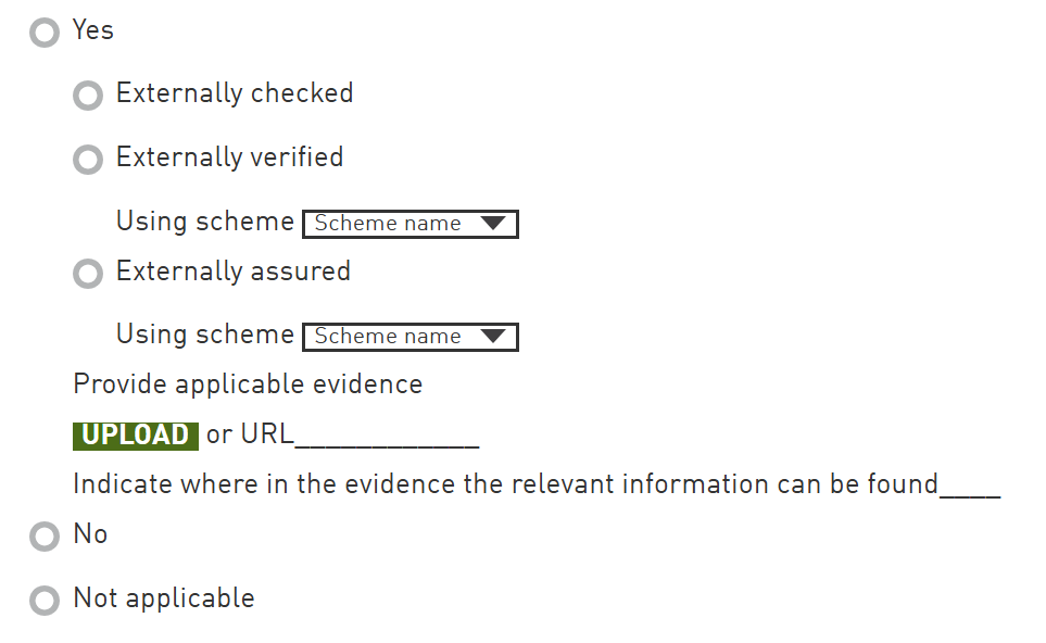 Applies to instances where a third party has reviewed the data against an existing scheme. When this checkbox is ticked, participants should select the scheme name from the dropdown.