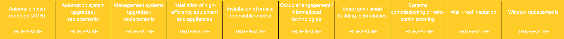 Select TRUE from the dropdown menus if the entity implemented measures during the last 3 years to improve the efficiency of the asset. Leaving dropdown menus blank is equivalent to FALSE.