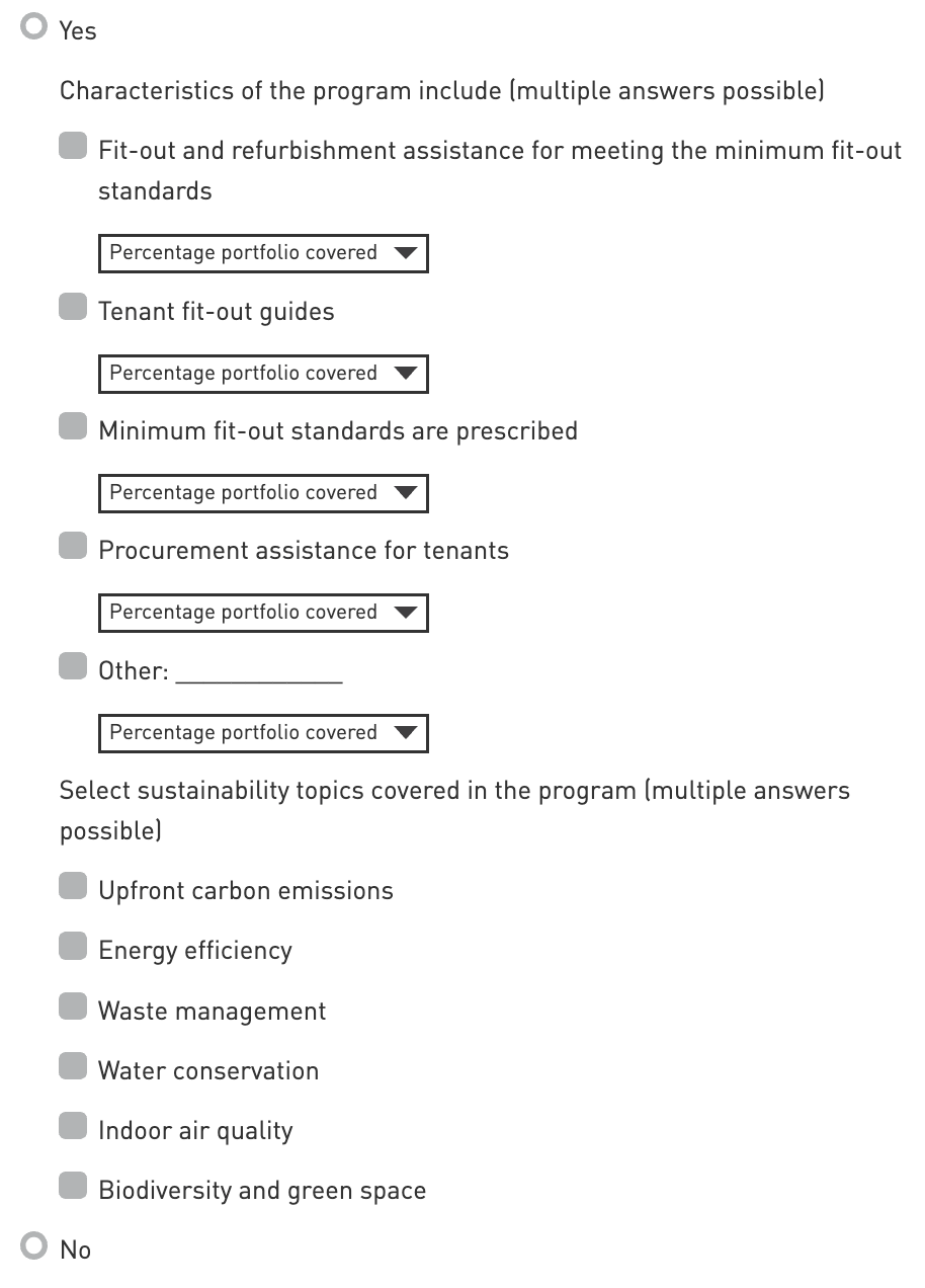 This indicator assesses how the entity addresses sustainability issues in the fit-out and refurbishment of tenant spaces and what sustainability topics are covered in the program. A fit-out and refurbishment program helps to align the views and actions of landlords and tenants during an early stage of the occupancy, prior to the tenant/occupier going into occupation. Guidance and support from the start of the lease reinforce the importance placed on sustainability issues and create the basis for sustainably operated buildings.