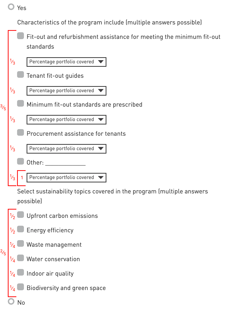 The scoring of this indicator is equal to the sum of the fractions assigned to the selected options and respective sub-options, multiplied by the total score of the indicator.