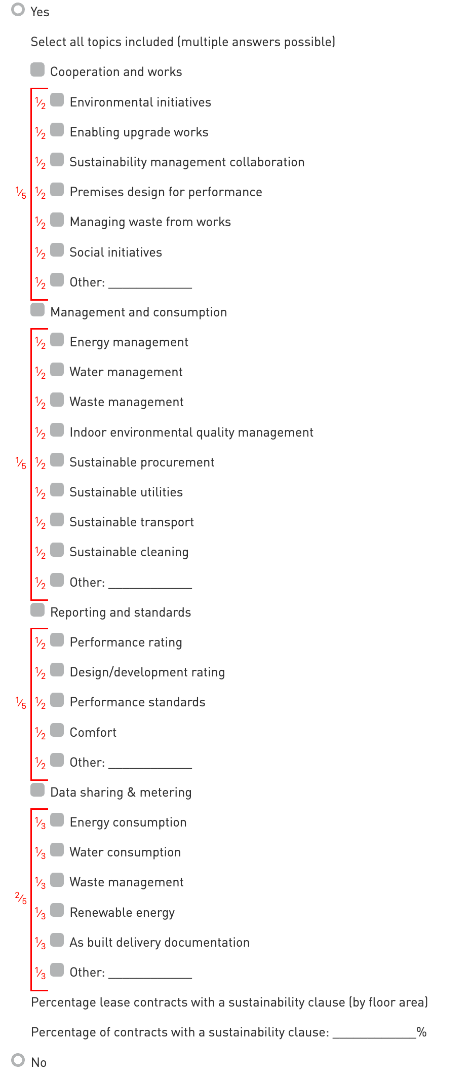 The percentage of lease contracts with a sustainability clause and sustainability topics covered in the program are not scored and are used for reporting purposes only