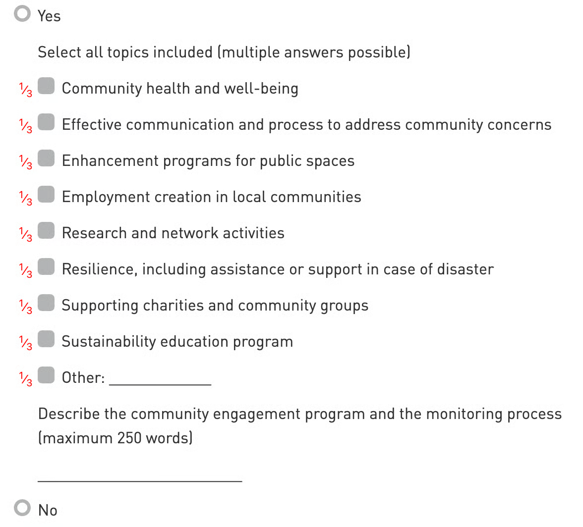 This indicator examines the strategies used by the entity to support communities associated with its operations. A structured and comprehensive approach to community engagement demonstrates the extent of integration of community engagement issues into the entity’s overall strategy.