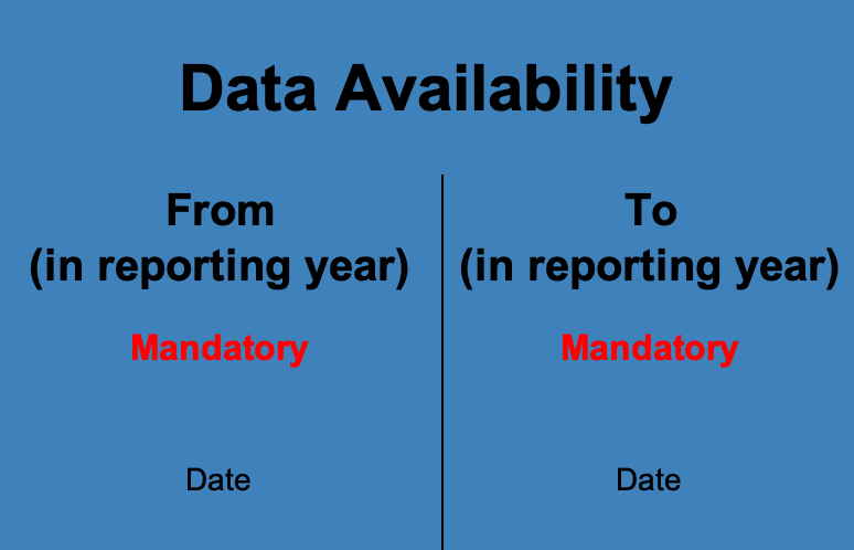 Indicate the period for which consumption data was collected. For example, if data is available only for the last six months of a calendar year (January–December), the data availability columns should reflect July–December and follow the day/month/year format. Ensure that all performance data aligns with the reporting year specified in indicator EC4 (Reporting year). Data Availability might differ from the Ownership Period (Reporting Characteristics) in the following cases: