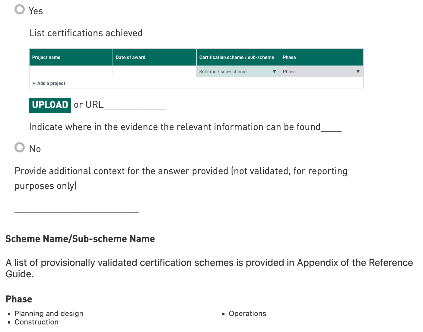 Select Yes or No: If you select 'Yes', provide at least one certification to complete the table.