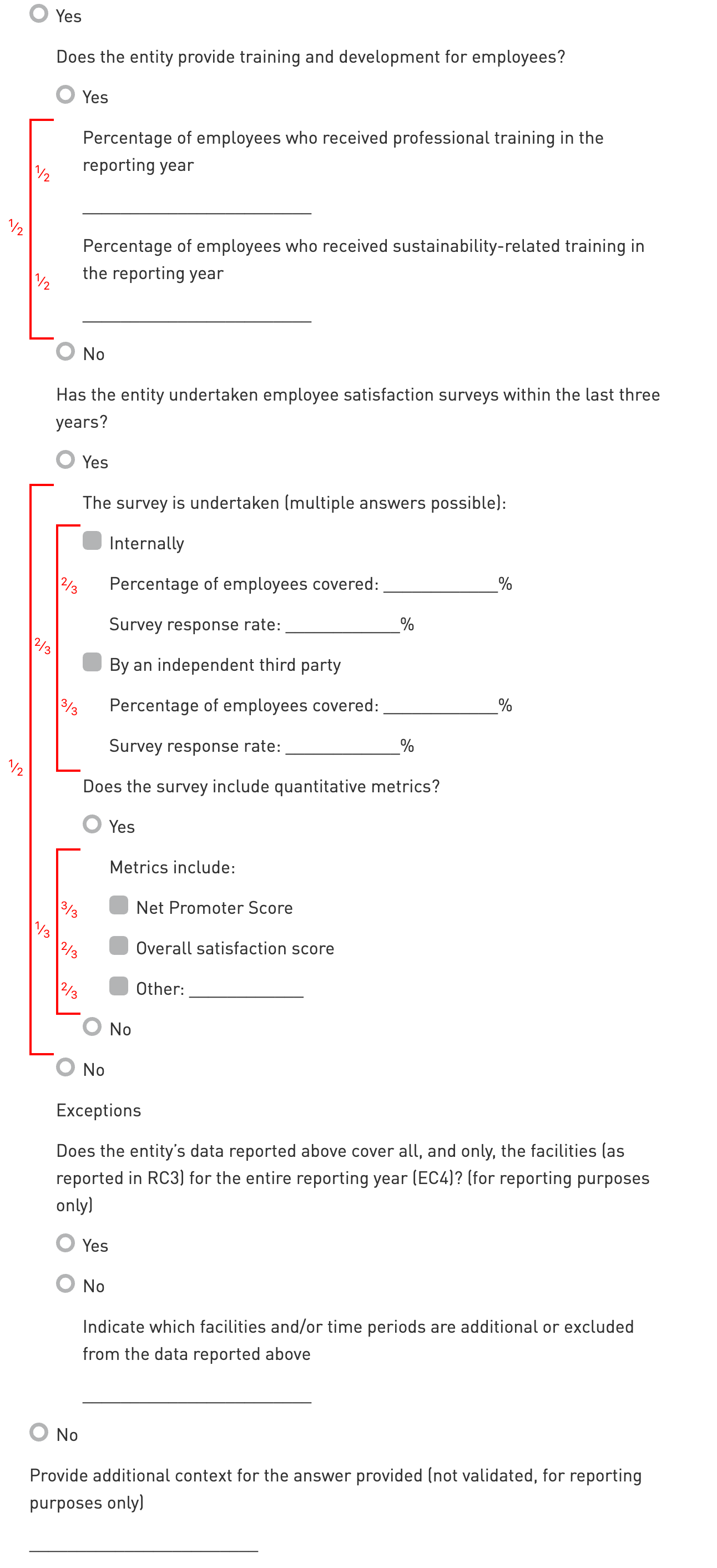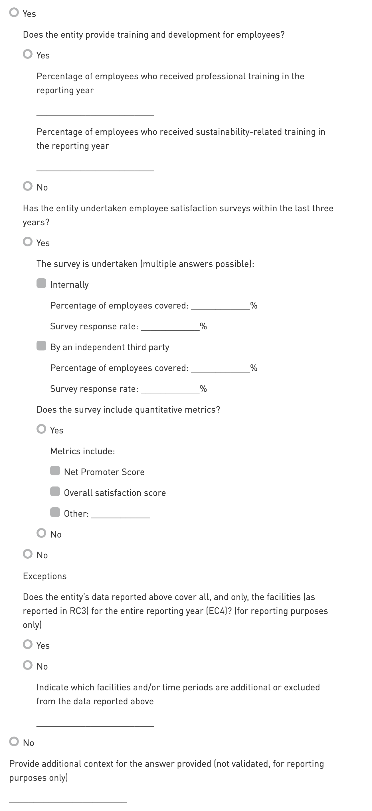 This indicator assesses the coverage and scope of the entity’s engagement with employees through training and satisfaction surveys. Training on sustainability-related topics supports the development of employee capability, strengthens human capital, and can contribute to higher satisfaction and improved business performance.