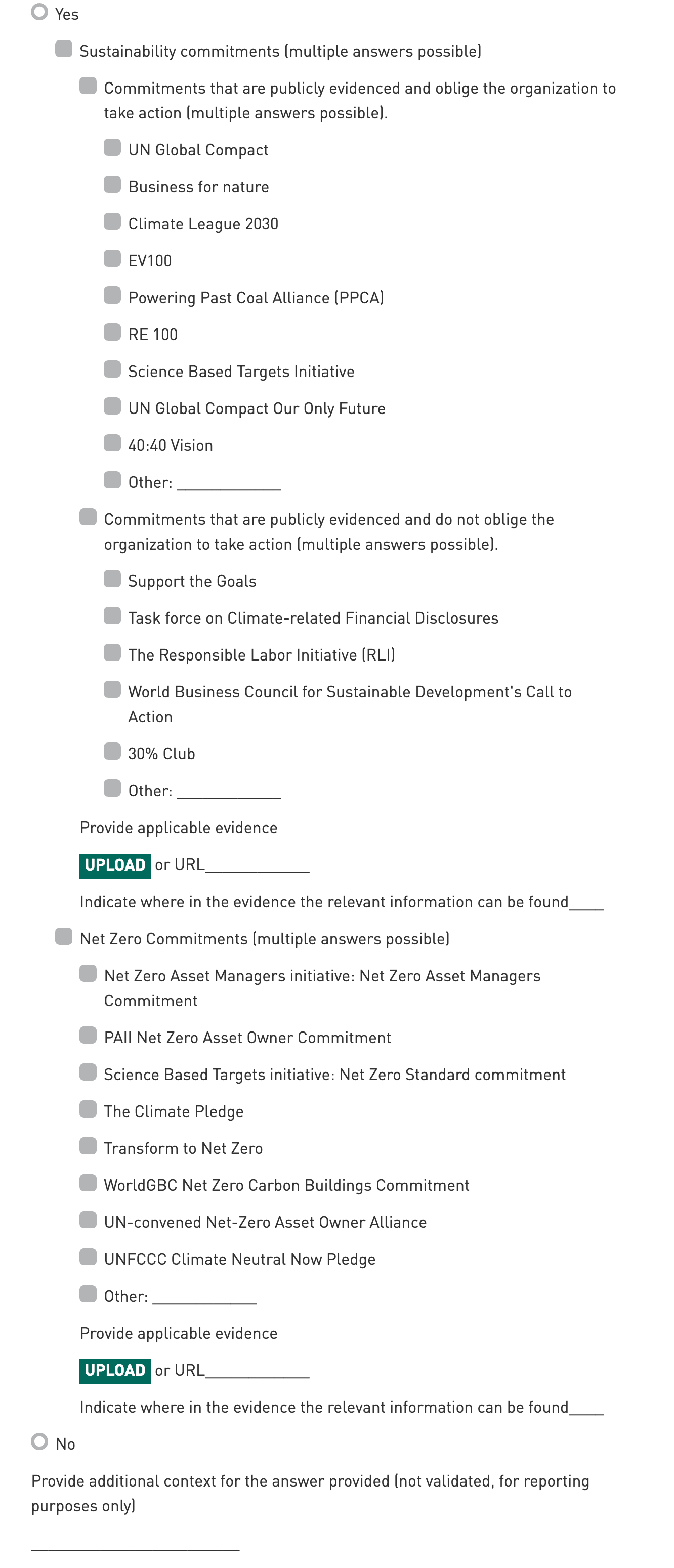Commitments: All commitments should be publicly available, and the entity should be either a member or signatory if it selects an option. The commitments are divided between those that require action to be taken by the entity and those that do not.