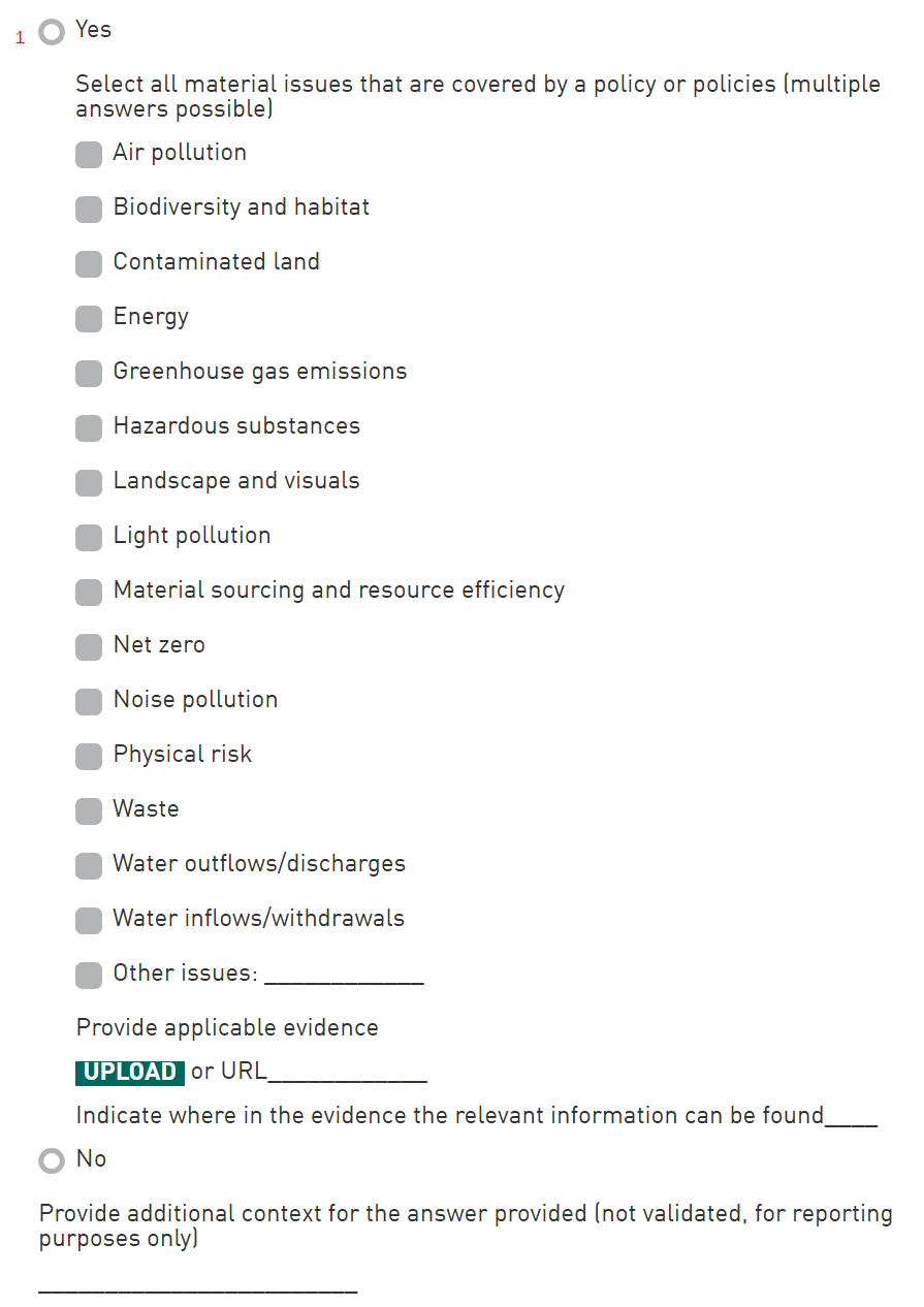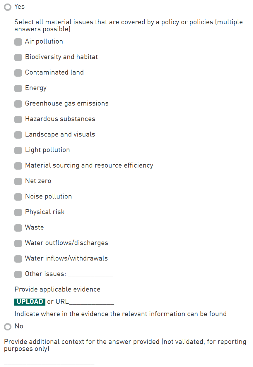 Material environmental issues: Select all issues that are covered by the entity’s policy / policies. The policy or policies must exist and be valid during the reporting year provided in EC4. It is possible to report using the ‘Other’ answer option. Ensure that the ‘other’ answer provided is not a duplicate or subset of another option. It is possible to report multiple ‘Other’ answers.