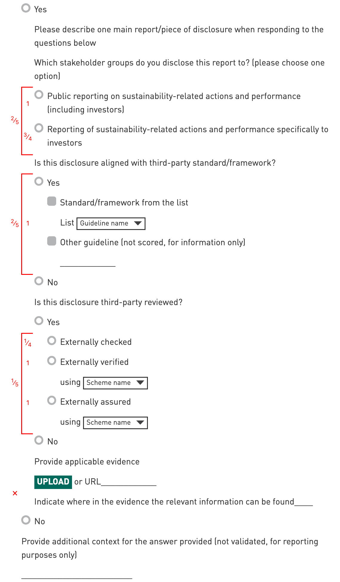 The scoring of this indicator is equal to the sum of the fractions assigned to the selected options and respective sub-options, multiplied by the total score of the indicator.
