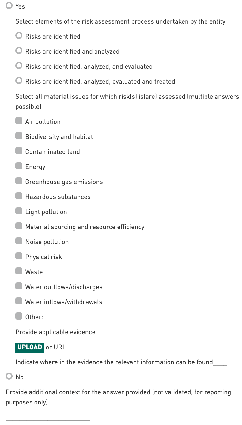 Material environmental issues: Select all issues that are covered by the entity’s risk assessment process(es). It is possible to report using the ‘Other’ answer option. Ensure that the ‘Other’ answer provided is not a duplicate or subset of another option. It is possible to report multiple ‘Other’ answers.