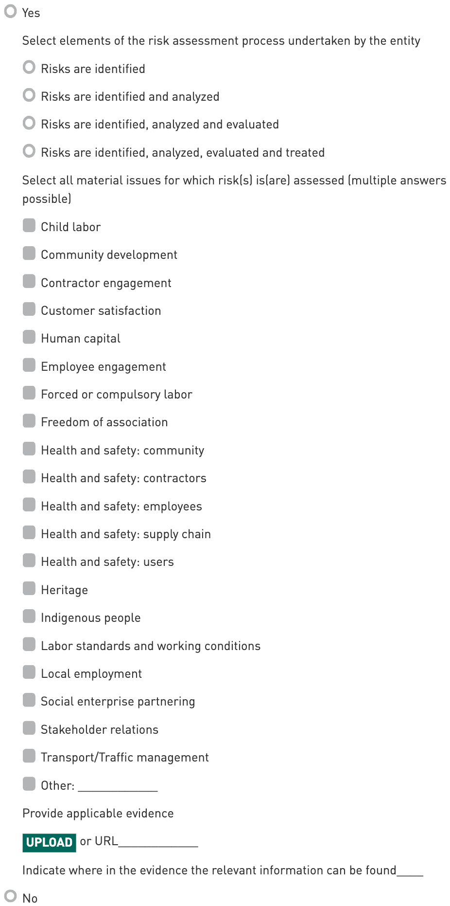 Add a response that applies to the entity but is not already listed. Ensure that the ‘Other’ answer provided is not a duplicate or subset of another option (e.g. “recycling” when “‘Waste” is selected). It is possible to report multiple ‘Other’ answers. If multiple ‘Other’ answers are listed, more than one may be accepted in manual validation.