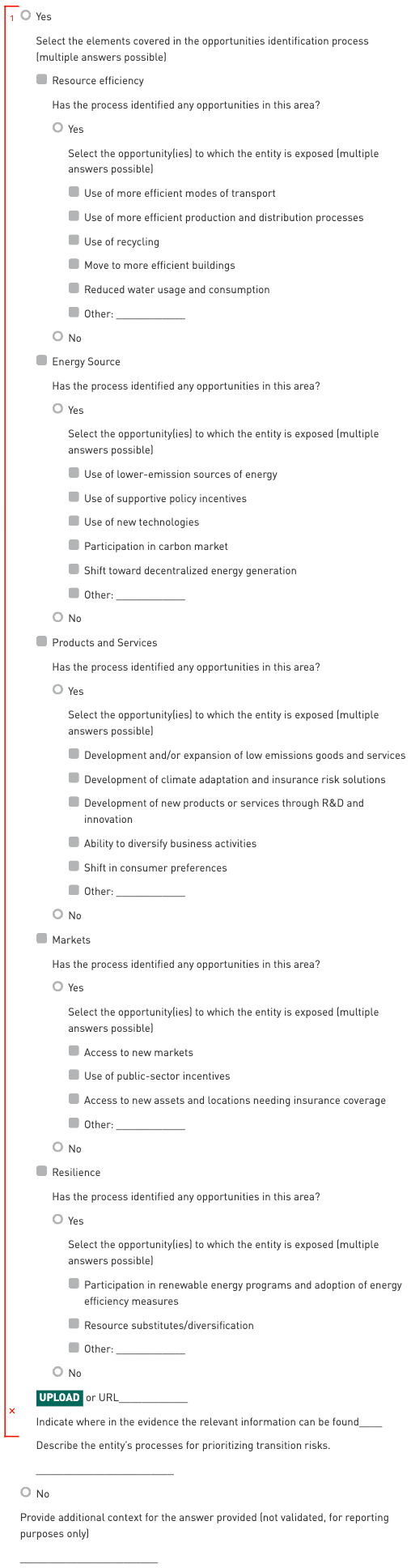 For Outcomes: An extract of a procedure undertaken, such as a risk and opportunities register or matrix, checklists, scenario analysis, or a section of a risk/opportunity framework or management plan addressing climate-related opportunities. Such documents can help exhibit the outcomes of the opportunity identification exercise.