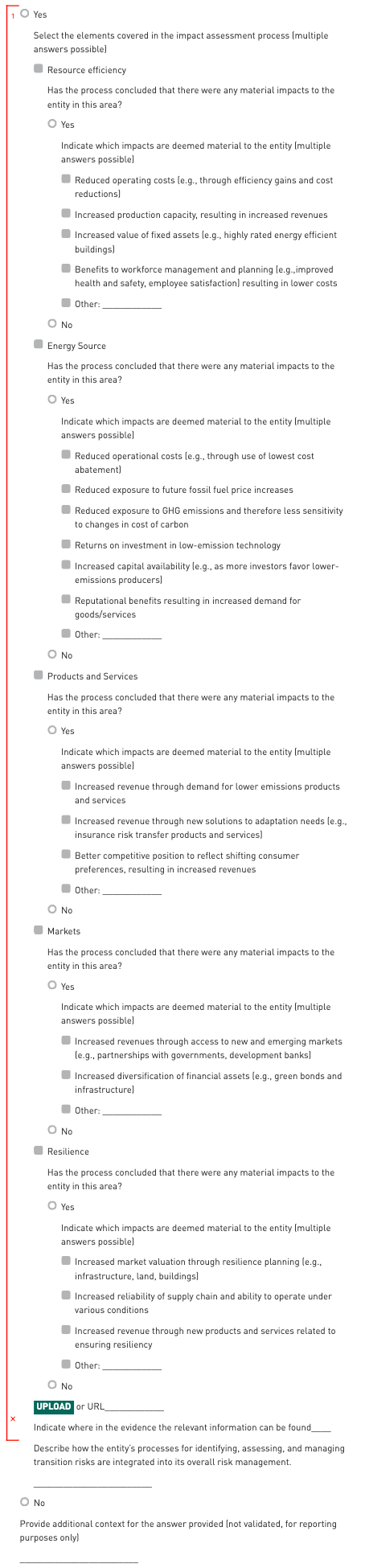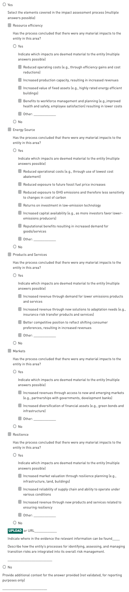 The intent of this indicator is to assess whether and how the entity uses a systematic approach for assessing the impact of climate-related opportunities on the business, operations, and/or financial planning of an entity.