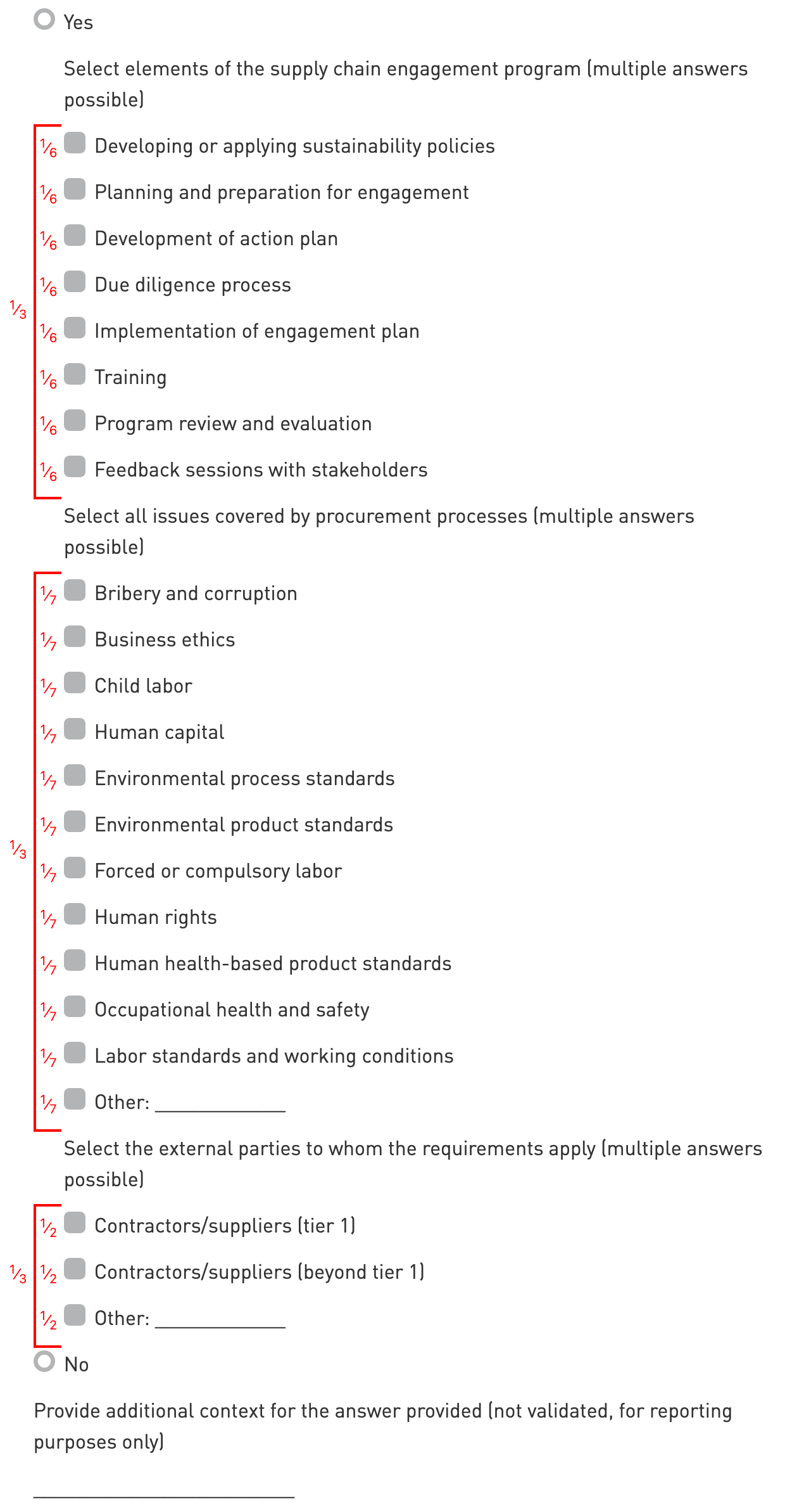 The scoring of this indicator is equal to the fraction assigned to the selected option, multiplied by the total score of the indicator.
