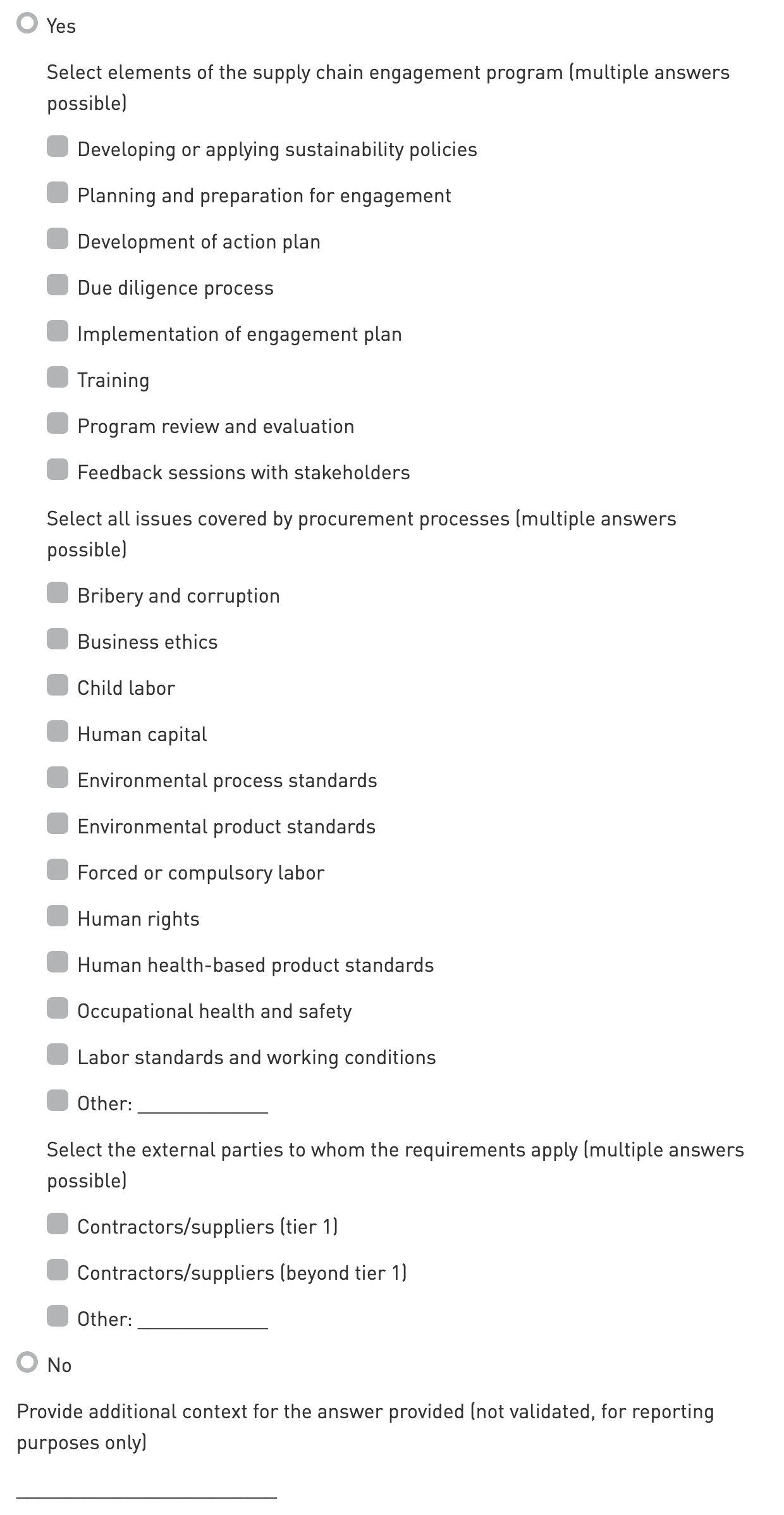 Issues covered by procurement processes: Select the issues that are included in the entity’s procurement processes. It is possible to report using the ‘Other’ answer option. Ensure that the ‘Other’ answer provided is not a duplicate or subset of another option. It is possible to report multiple ‘Other’ answers.