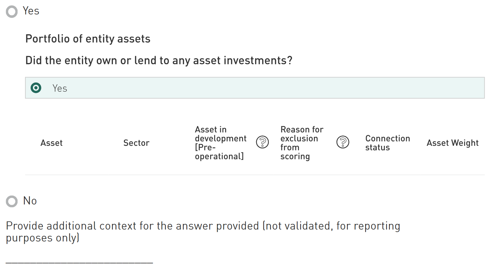 Answer ‘Yes’ if the relevant asset was in development (pre-operational) during the reporting year or ‘No’ otherwise. Answering ’Yes’ will indicate that the asset will feed into the GRESB Development Score – Infrastructure Fund. Answering ’No’ will indicate that the asset will feed into the GRESB Score – Infrastructure Fund. This field is automatically populated if the assets report to GRESB, and it is based on the GRESB Assessment taken by the asset.