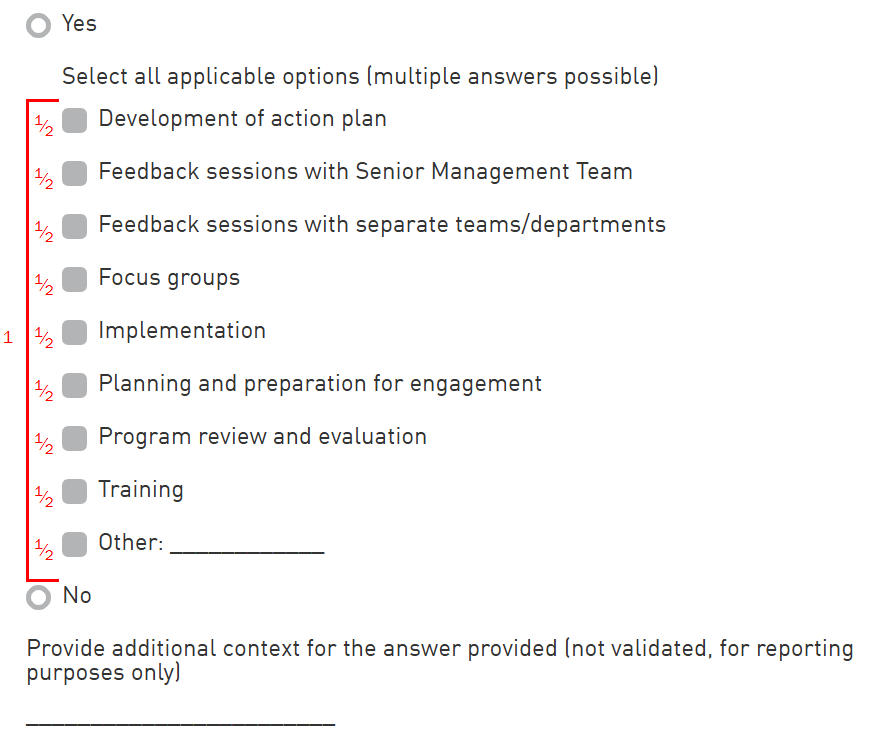 Elements of employee program: Select the elements that apply to the program. It is possible to report using the ‘Other’ answer option. Ensure that the ‘Other’ answer provided is not a duplicate or subset of another option.