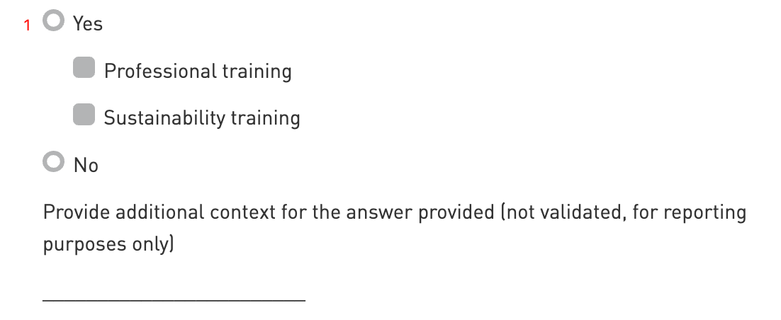 Training related to environmental, social and governance issues. Examples of sustainability-specific training topics include, but are not limited to: sexual harassment prevention, workplace discrimination and inclusivity, cybersecurity, health and safety, resources and waste management.