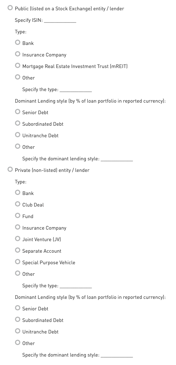 Describe the real estate lender type and nature of the participating entity. Participants should select the most applicable type that fits the reporting entity. This criteria may be used for peer benchmarking purposes.