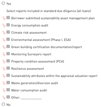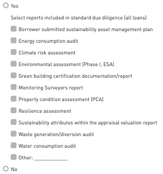 Identify sustainability-related information included within the lender’s standard due diligence process. Please indicate which sustainability-related third-party reports are evaluated during due diligence.