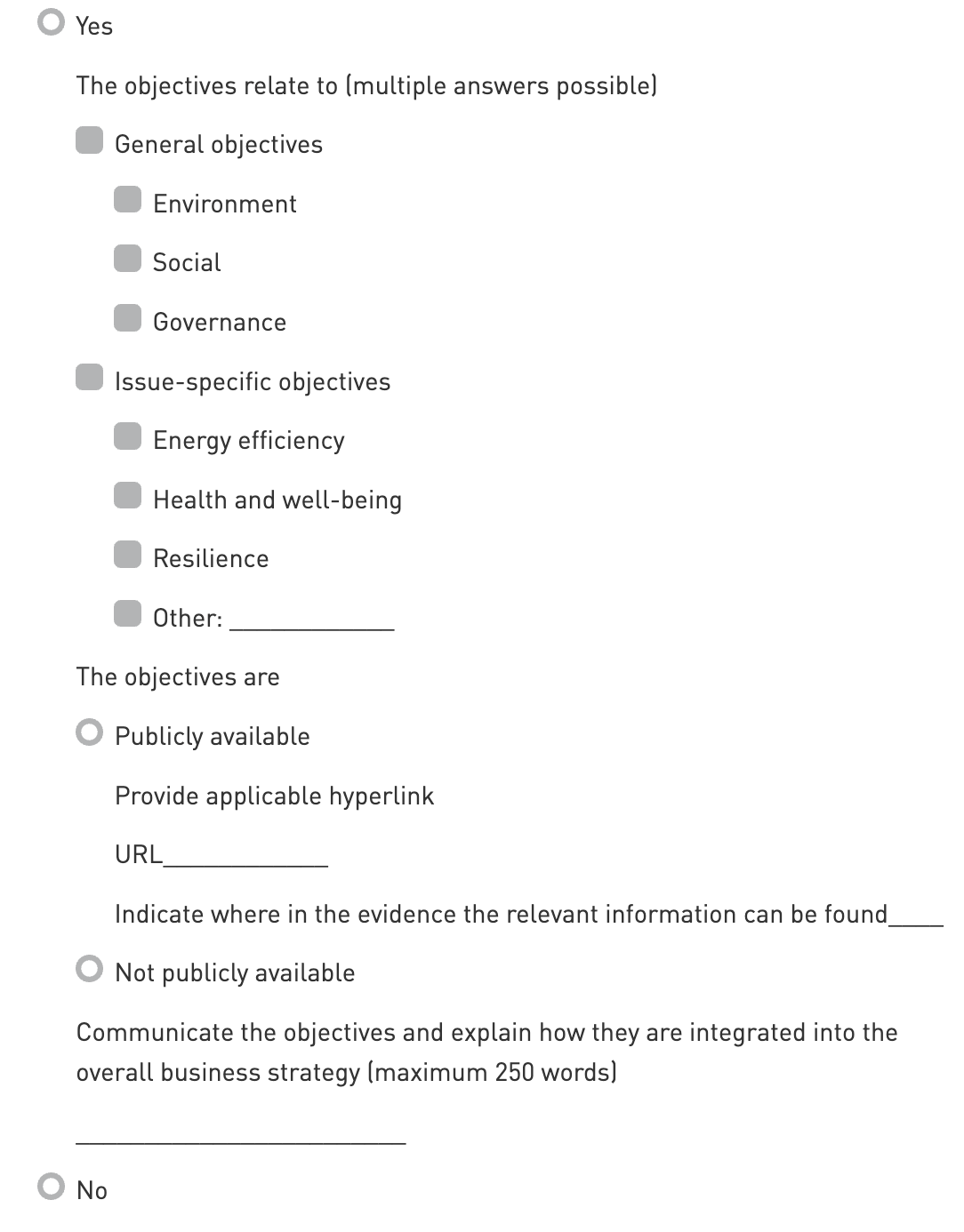 URL: When selecting "Publicly available," it is mandatory to include a hyperlink. The link will only be used for reporting purposes. Ensure that the hyperlink is not outdated and that the relevant page can be accessed within two steps. The URL should demonstrate the existence of publicly available sustainability objectives for each of the objectives selected.