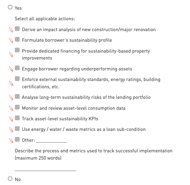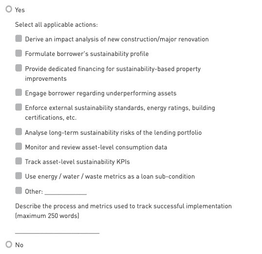 State actions that participant takes to achieve sustainability objectives. These actions must be related to commercial real estate lending.